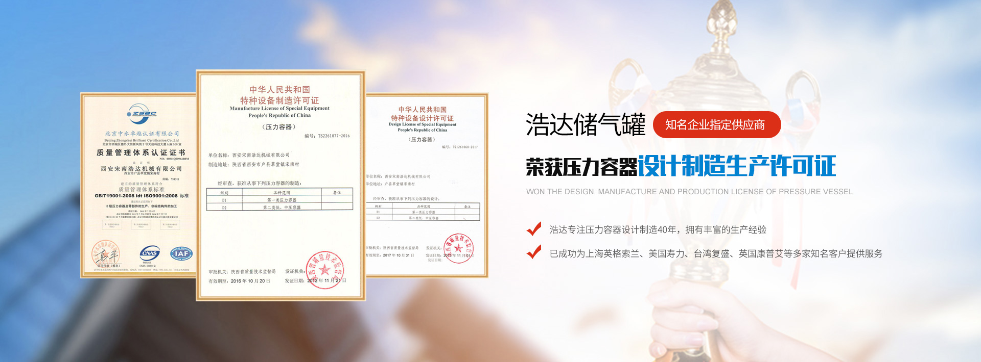 西安宋南浩達機械有限公司是陜西首批取得壓力容器制造許可證的廠家,是陜西省定點生產(chǎn)壓力容器的專業(yè)工廠,現(xiàn)有近40年的制造歷史。